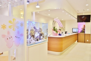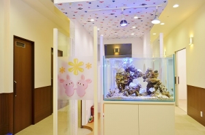 この医院には、来院したお子様が遊べるスペースの横に海水魚水槽があり、待合室からも、水槽越しに子供達の様子がうかがえるように作られています。